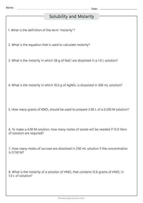 A solubility and molarity worksheet is a tool used to help understand the concepts of solubility and molarity. It provides a way to calculate the concentration of a solution, as well as the amount of a given compound that can be dissolved in the solution. The worksheet also includes questions to help students understand the concepts better.
